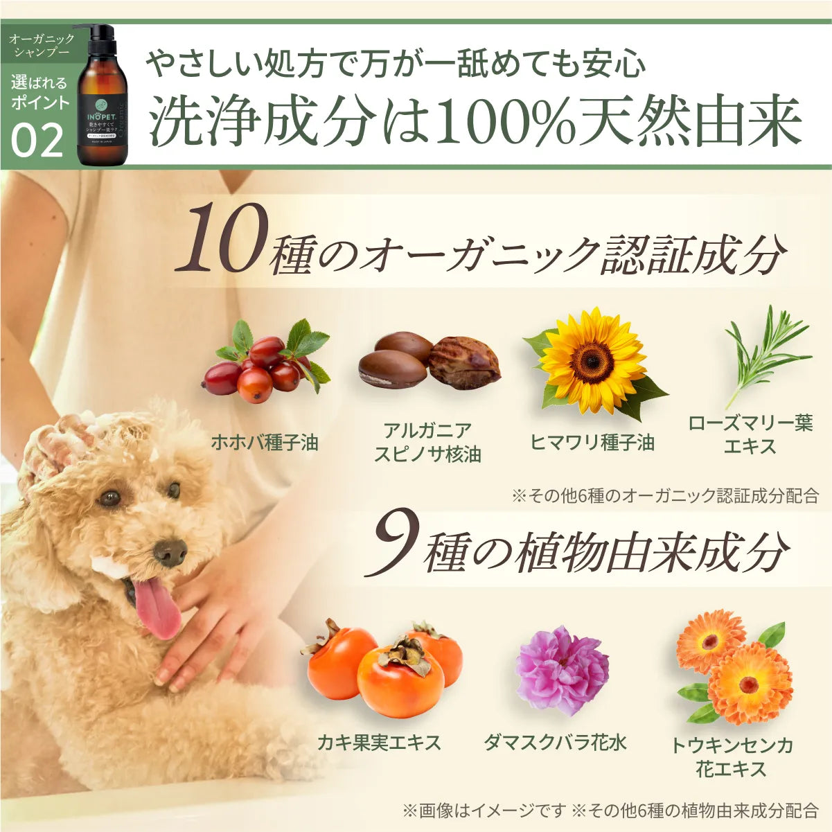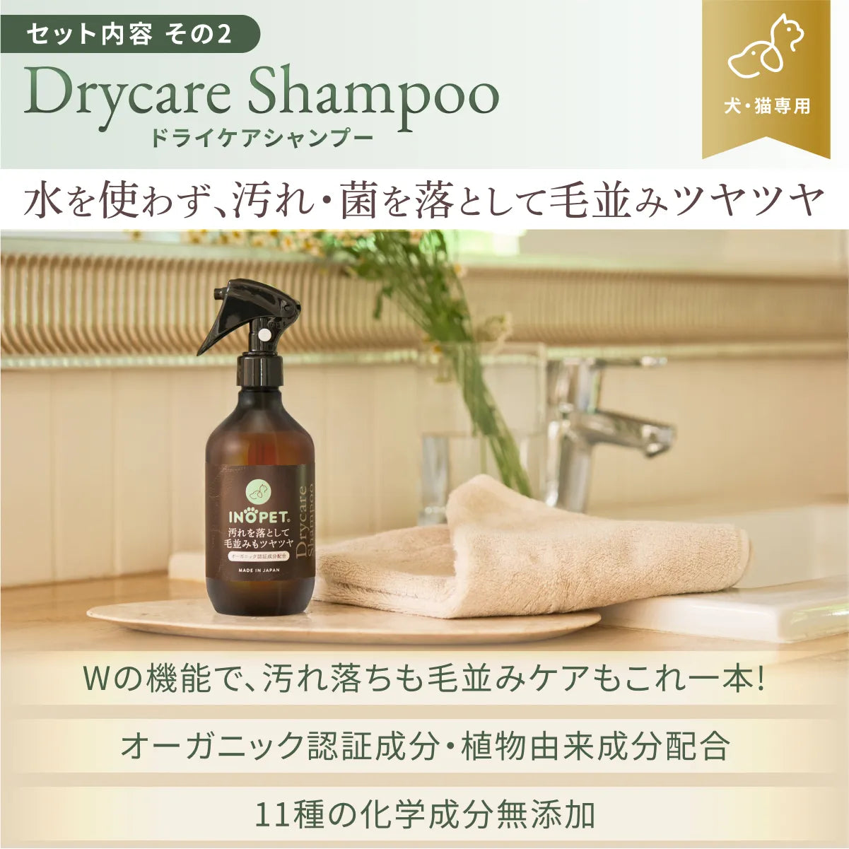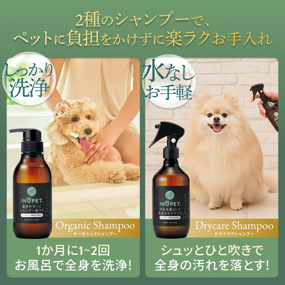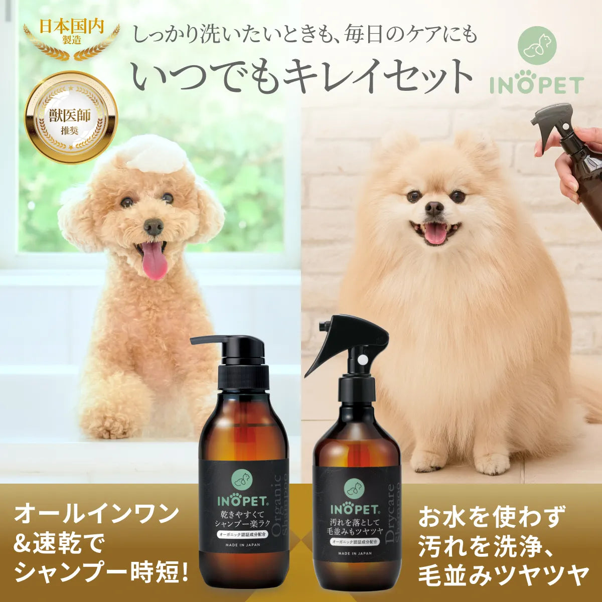 しっかり洗いたいときも、毎日のケアにも、いつでもキレイなセット! オーガニックシャンプーで、1か月に1~2回全身をすっきり洗浄。 速乾発想のオールインワンシャンプーだから、ペットと飼い主さんの負担を軽減します。普段のケアには、汚れ落ちと毛並みのケアが同時に叶うドライケアシャンプーで、簡単洗浄!ペットに負担をかけずに、いつでも全身キレイ。