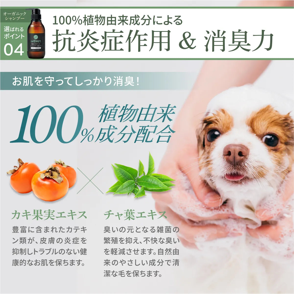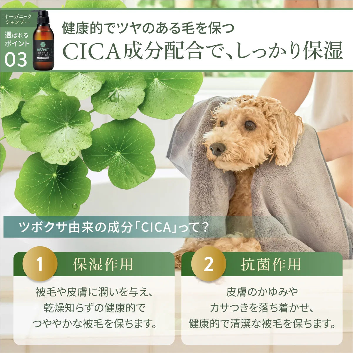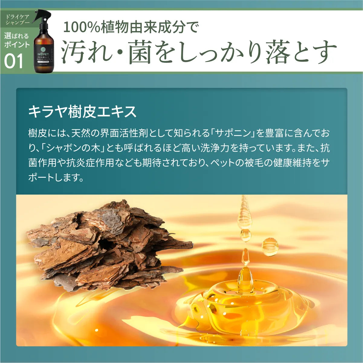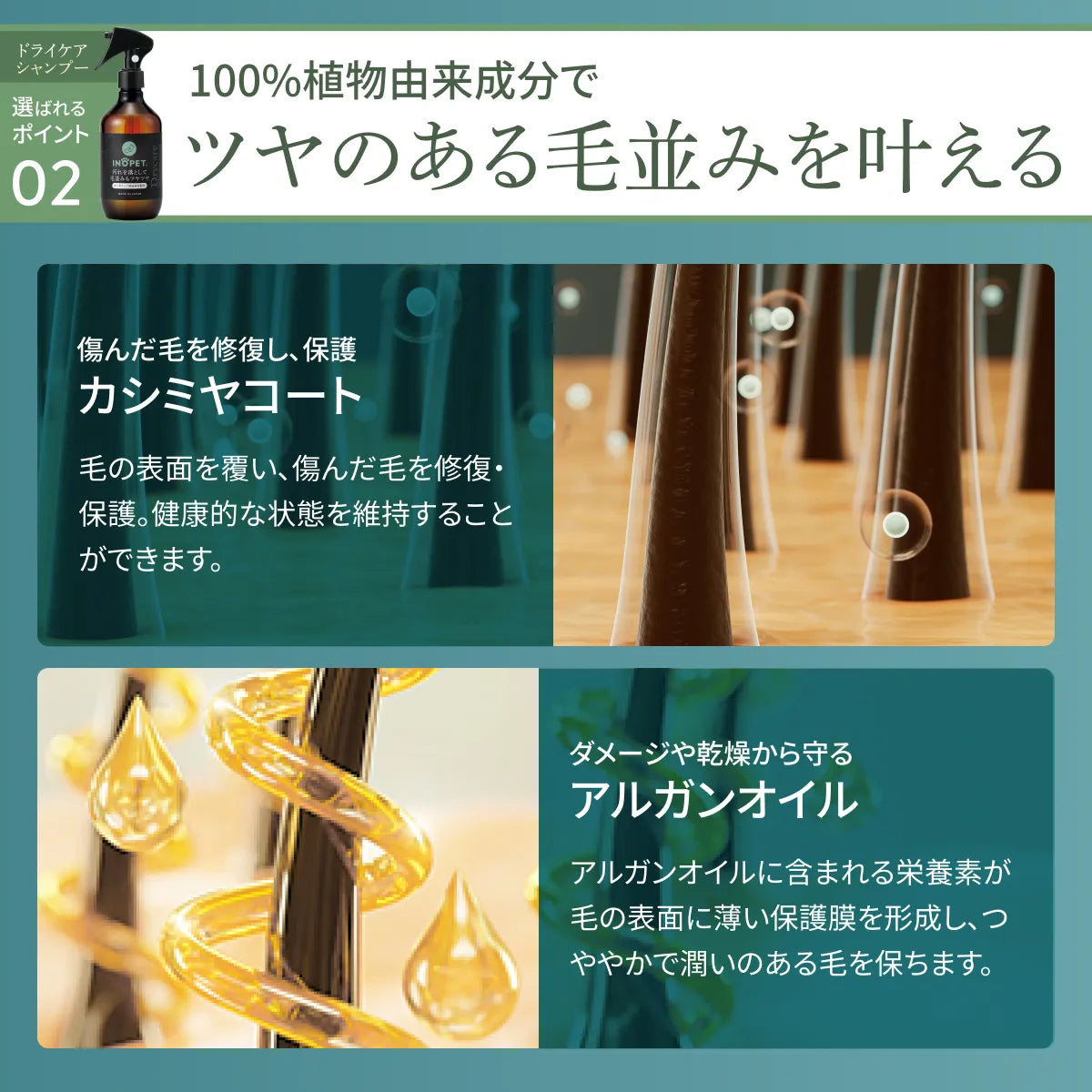 しっかり洗いたいときも、毎日のケアにも、いつでもキレイなセット! オーガニックシャンプーで、1か月に1~2回全身をすっきり洗浄。 速乾発想のオールインワンシャンプーだから、ペットと飼い主さんの負担を軽減します。普段のケアには、汚れ落ちと毛並みのケアが同時に叶うドライケアシャンプーで、簡単洗浄!ペットに負担をかけずに、いつでも全身キレイ。