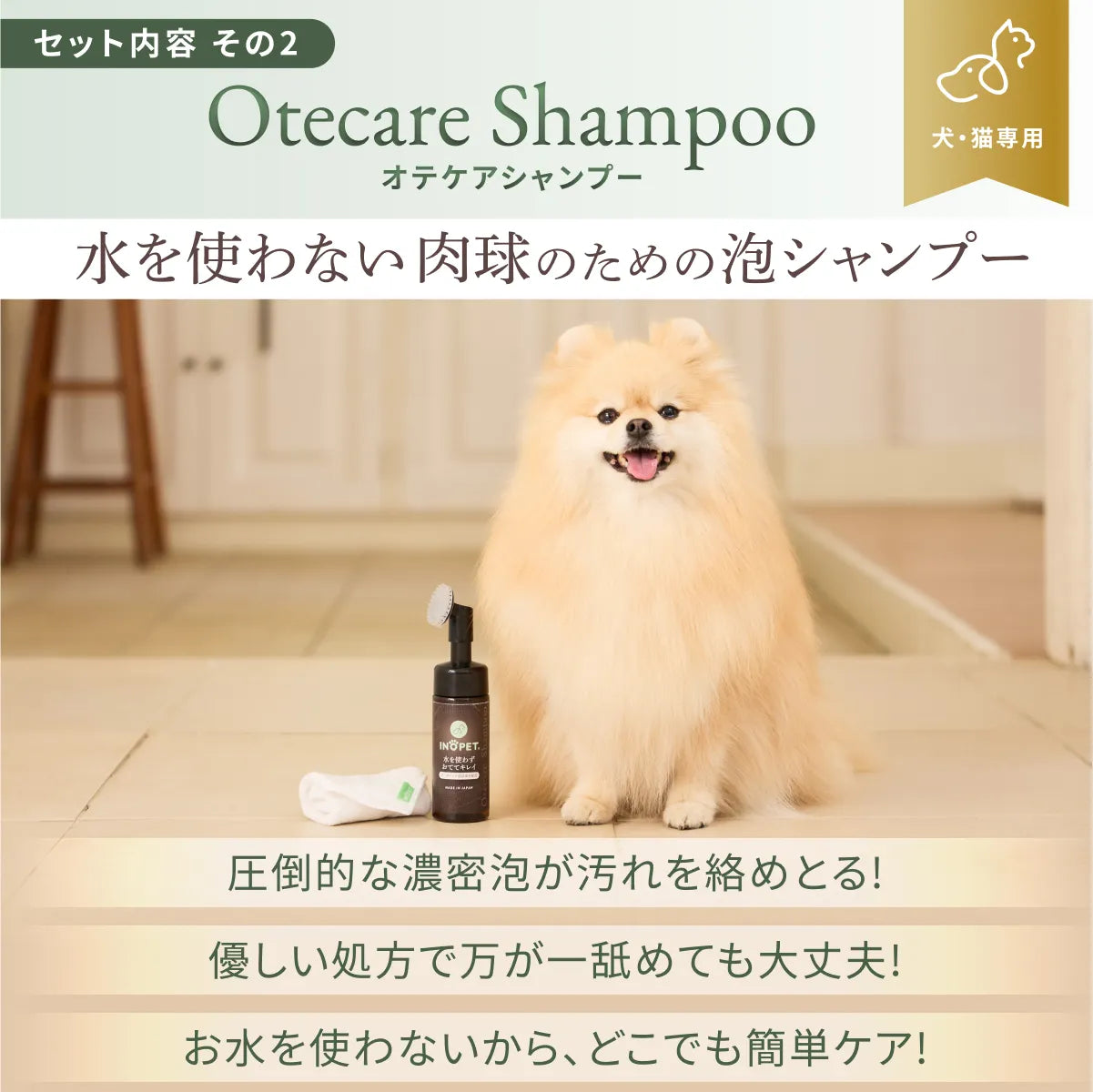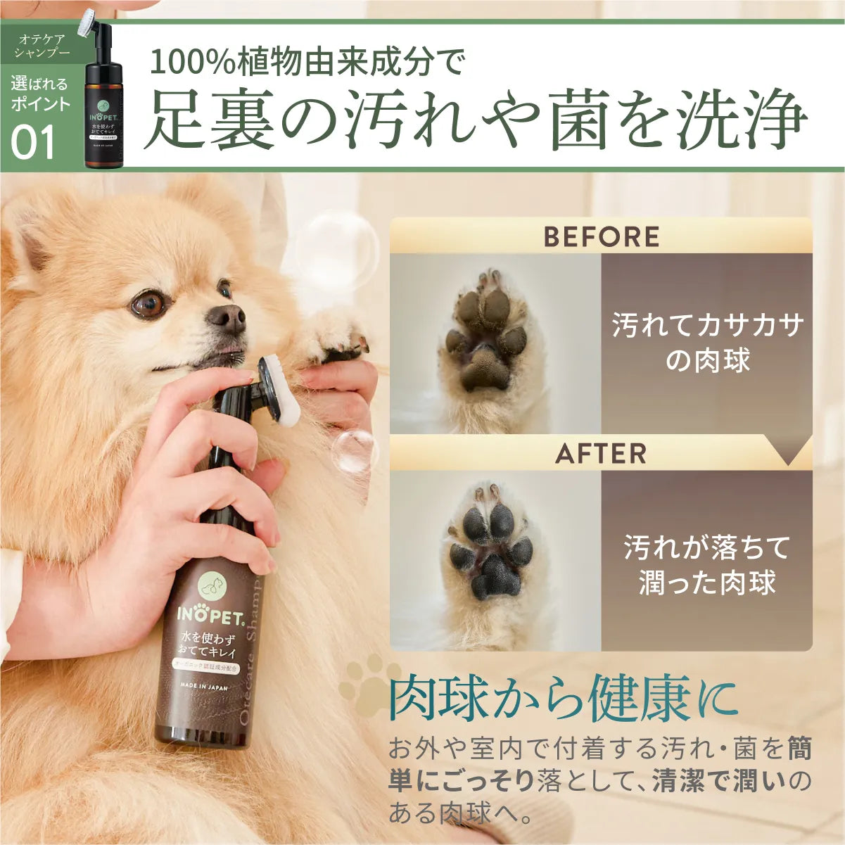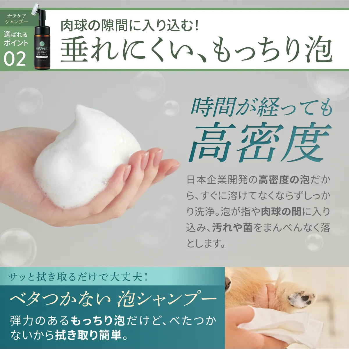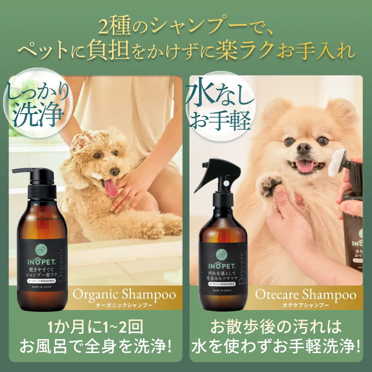 オーガニックシャンプーで、1ヶ月に1~2回全身をすっきり洗浄。 速乾発想のオールインワンシャンプーだから、ペットと主飼いさんの負担を軽減します。汚れた肉球にはオテケアシャンプーで、水を使わずに簡単洗浄。2つのシャンプーで、負担をかけずに全身キレイ!