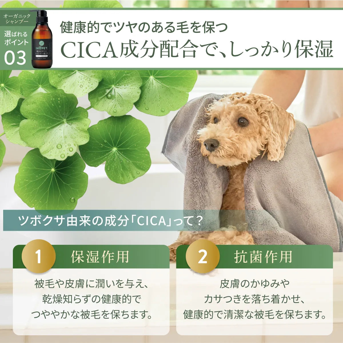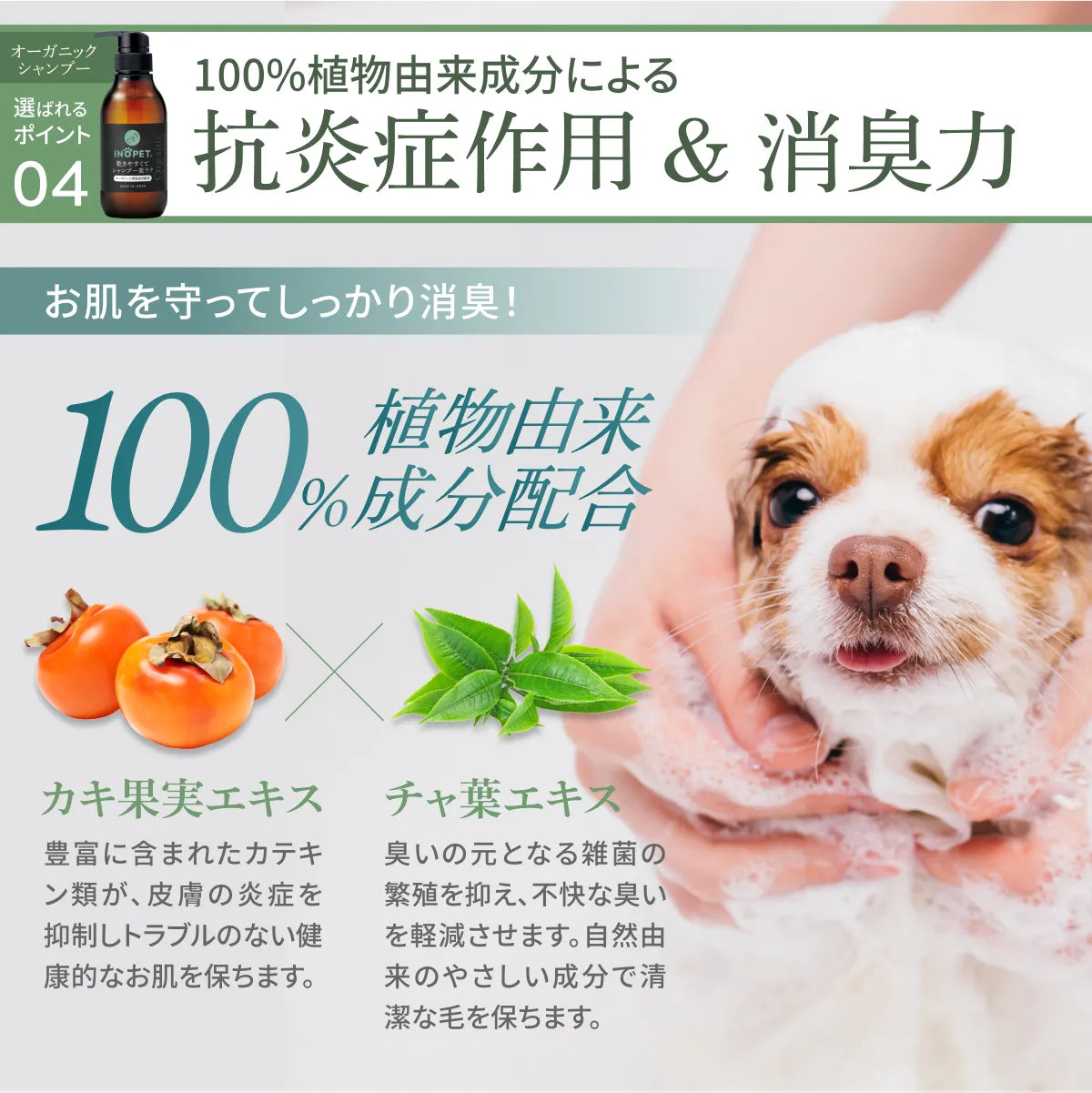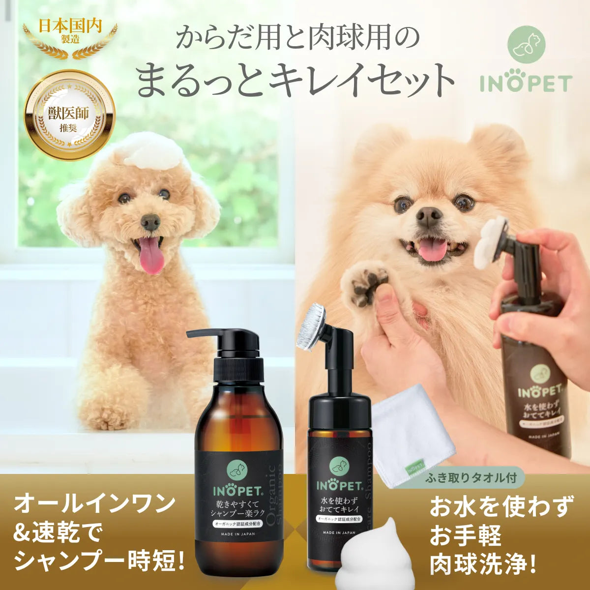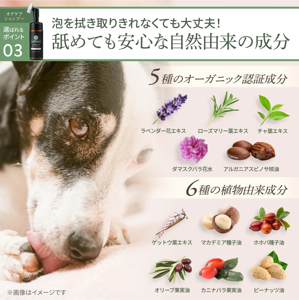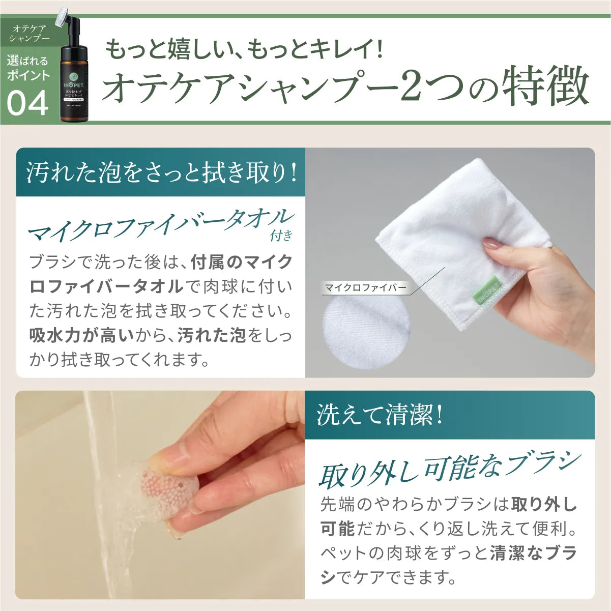 オーガニックシャンプーで、1ヶ月に1~2回全身をすっきり洗浄。 速乾発想のオールインワンシャンプーだから、ペットと主飼いさんの負担を軽減します。汚れた肉球にはオテケアシャンプーで、水を使わずに簡単洗浄。2つのシャンプーで、負担をかけずに全身キレイ!