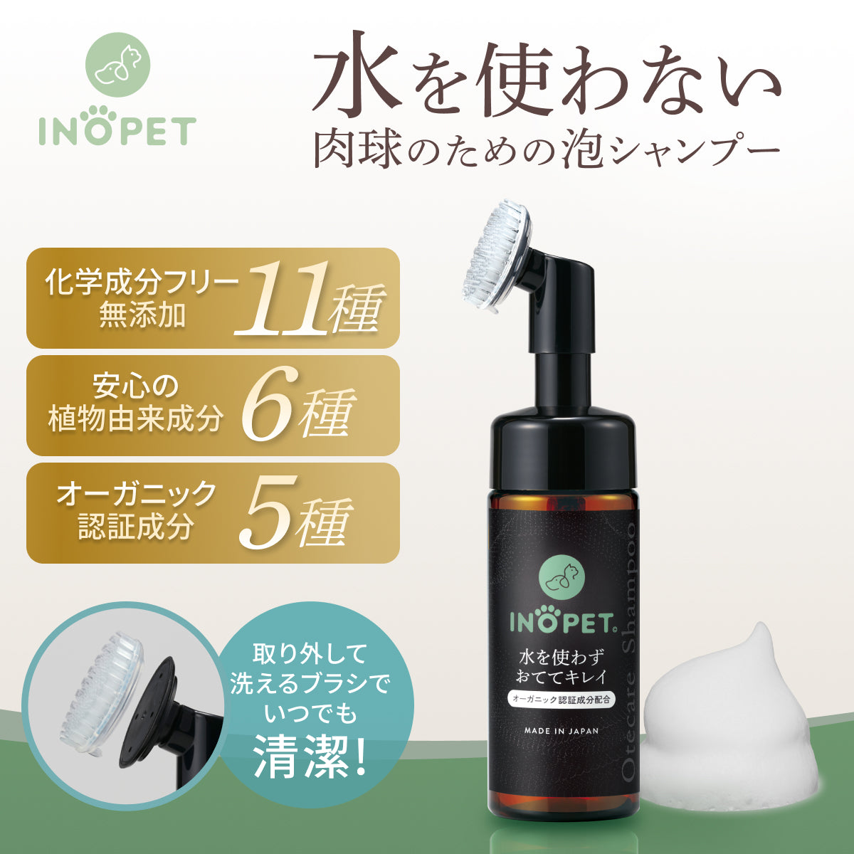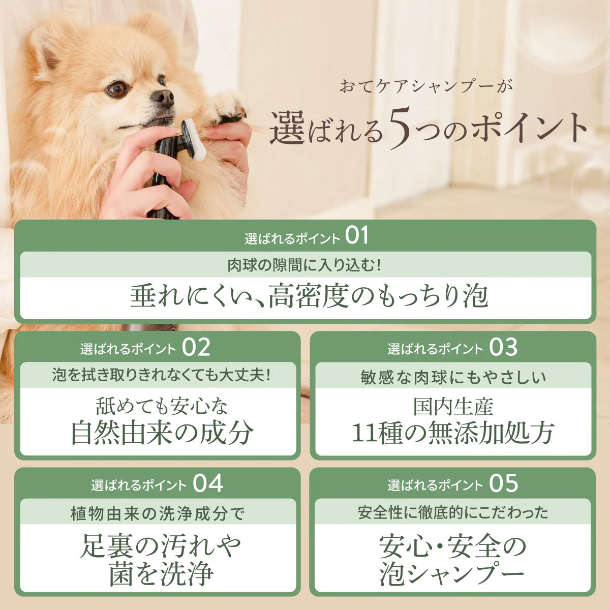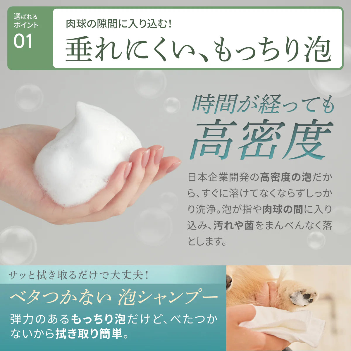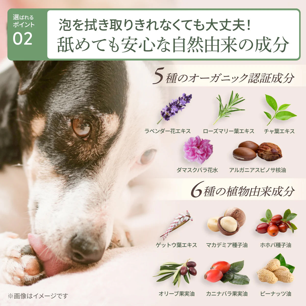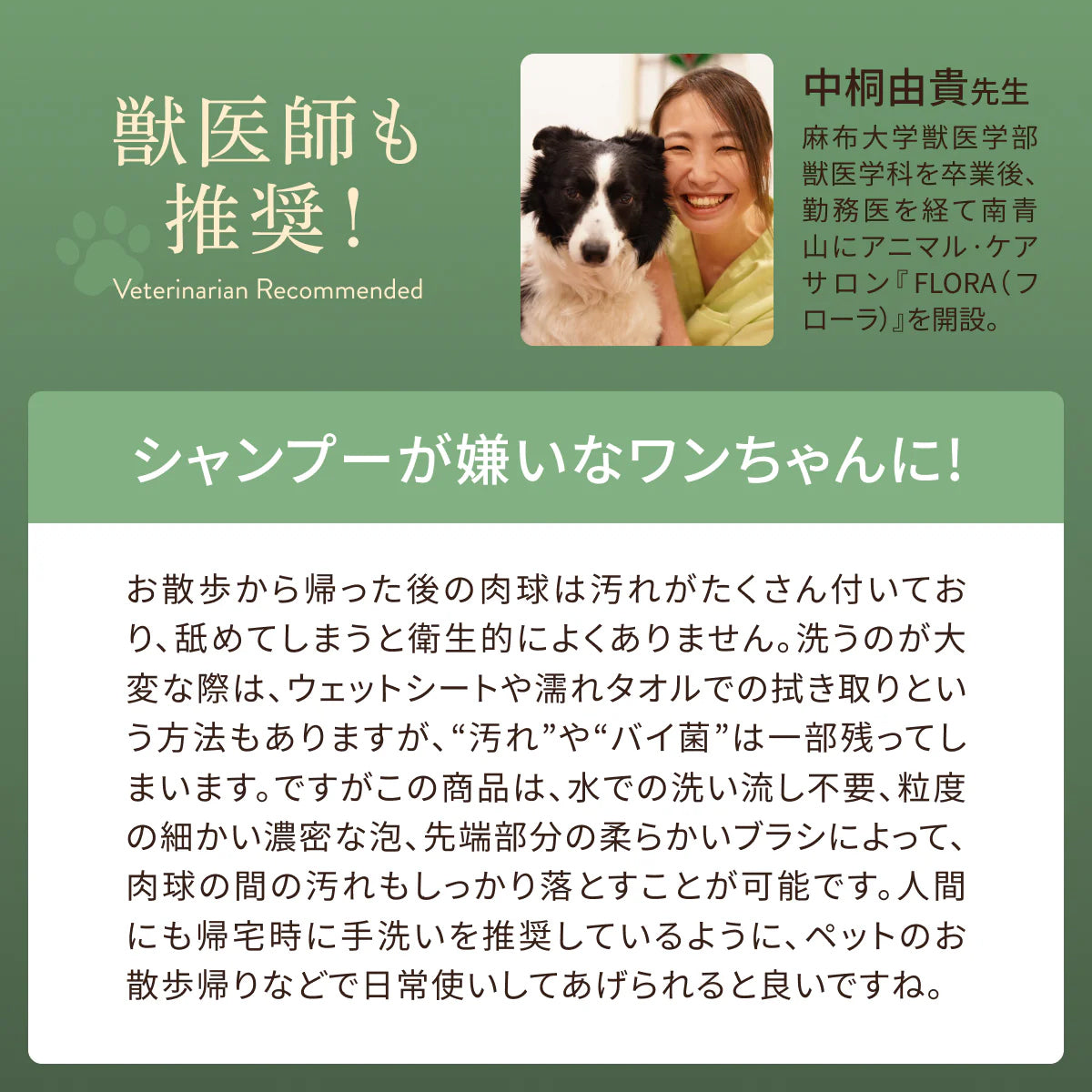 獣医師推奨!濃密泡とやわらかブラシで、お水を使わず肉球汚れをしっかり洗浄!オーガニック認証成分5種配合、植物由来成分6種配合、11種の無添加で、万が一拭き取り切れなくても大丈夫。